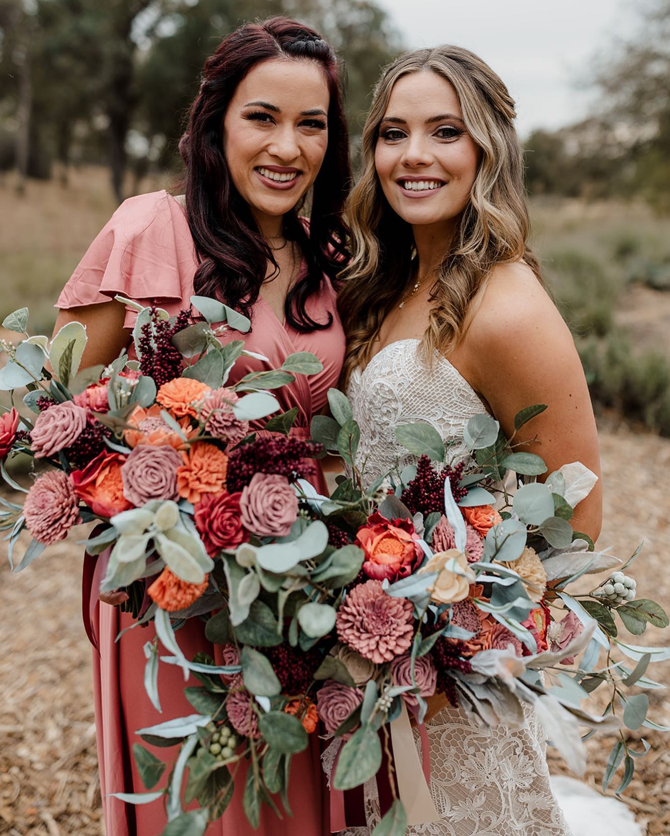 Made with sola wood flowers and faux greenery, these will last a lifetime. The boho/wild style is exactly how it sounds- loose and wild.